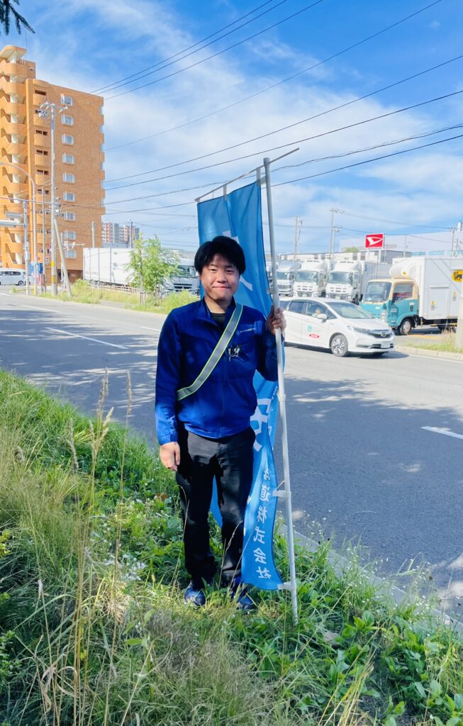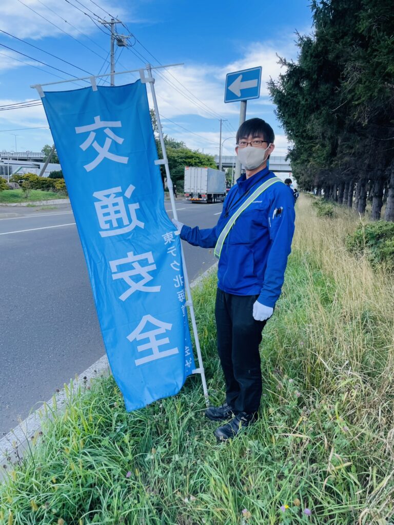 また、清掃活動と並行して通行中のドライバーの皆さまへ「安全運転」を呼びかけ、交通事故防止の意識啓発を行いました。