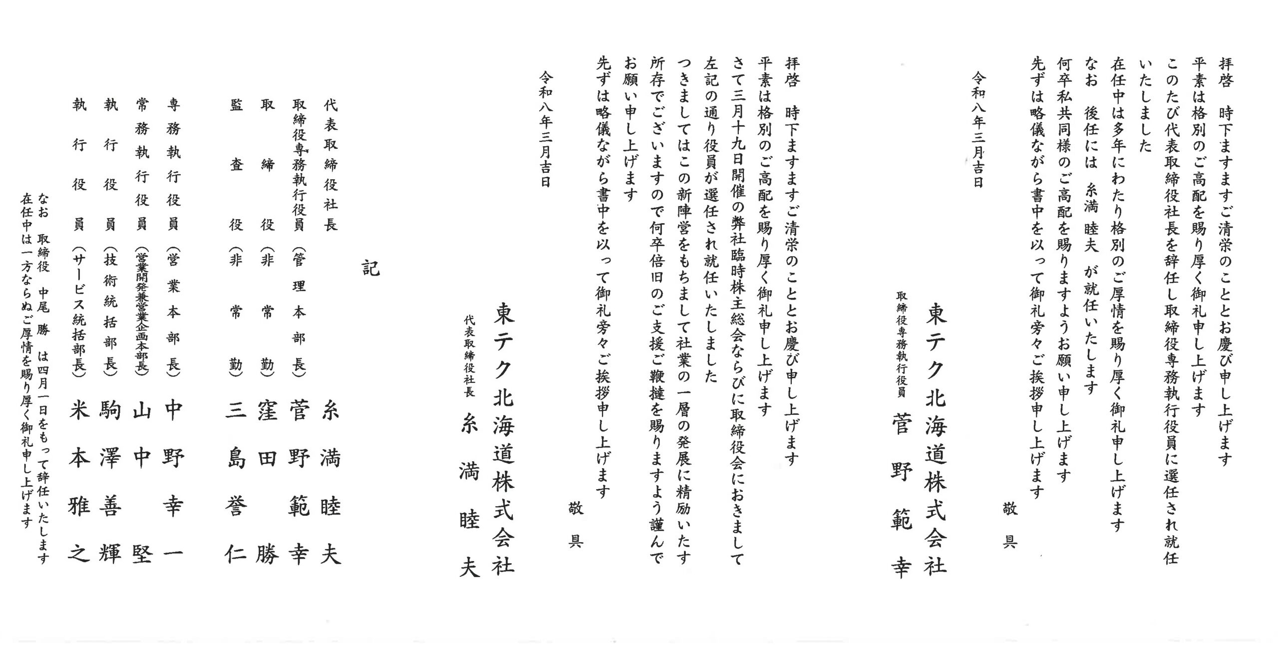 2026.3.25 代表取締役及び、執行役員異動のお知らせ 代表取締役及び執行役員の異動について、2026年4月1日付で上記の通り決議いたしましたのでお知らせ申し上げます。今後とも一層のご指導ご支援を賜りますようお願い申し上げます。 代表取締役及び、執行役員異動のお知らせダウンロード お知らせ一覧